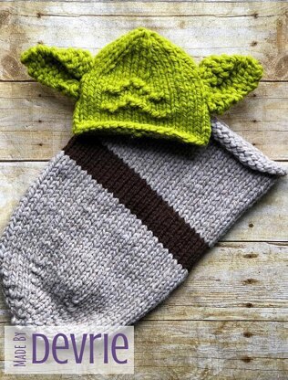 This adorable Yoda inspired cocoon is perfect for any newborn or 3 month photo session. Beginners can make it quickly with chunky yarn and US size 11 double pointed needles.