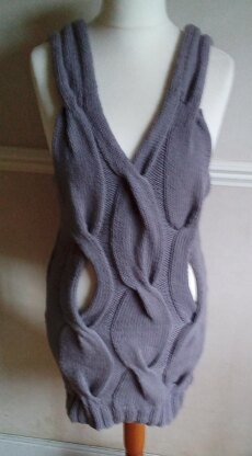 This high fashion cable top is available in two versions. The first is very low cut at the front with a deep V at the back. Alternatively, the top can be knitted with the same depth of V at both the front and the back for a more modest look. If you wish, the low cut version can be worn two ways: one way is with the deep V at the front; the second is with the deep V at the back and the higher version neck at the front. Alternatively, wear the top over a t-shirt.
