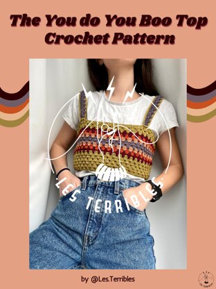 The you do you boo top is a crochet pattern that uses US terms, it is size inclusive (XS to 5XL). PLEASE, note that this is not a finished product, but a pattern! Material: 2.5 mm hook for ribbing; Sewing needle ; Stitch markers. Size 1 yarn, I suggest Hobbii rainbow 8/4. For yardage, it depends on the length. The following suggestions are for a cropped version, consider getting more if you're planning on making the top or the straps longer!