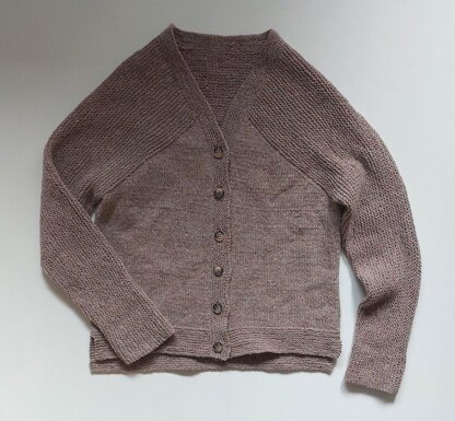 With unique construction, the cardigan starts with a split hem from the bottom, then joined at the sides. The body is worked in rows from band edge to band edge, then separated at underarm, with back and fronts using short row stockinette shaping. Next, stitches for the sleeves are cast on and worked together with the upper fronts and back in garter stitch; the sleeves are joined at the shoulders using the 3-needle method. Finally, stitches for the button and buttonhole bands are picked up and worked in garter stitch.