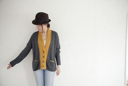 ゆったりしたサイズのカーディガン。前立てやポケットの差し色も素敵ですが、裾に入ったさりげない引上げ模様もポイントの1つ。色々な技法が詰まっていて編み手を飽きさせない作品になっています。帽子を合わせ、マニッシュに着こなして。
