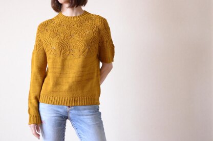 “Yurinoki” is a circular yoke pullover with a flower lace pattern on the yoke. You can choose the sleeve length from two options – short or long. It is worked from the top down seamlessly. After several short rows, the yoke is worked in the round with Yurinoki (tulip tree) pattern, and the lower body is knit straight in one piece in the round. Sleeves stitches, set aside at the underarm, are worked down in the round to the short or long option.