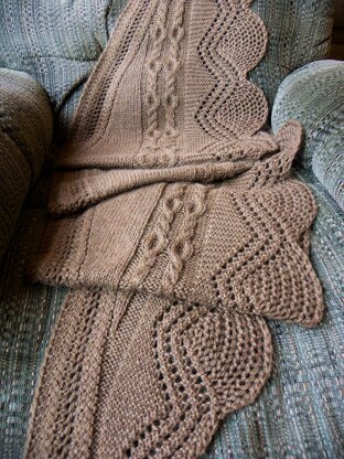The shawl is knit in one piece, the gentle curve created by increases or decreases every 4th row. Lots of texture, mesh scallops, intertwined cable and a combo of twisted stitches with eyelets.