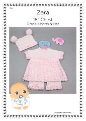 Zara is a Baby Knitting Pattern for a short-sleeved dress, shorts and a Hat to fit a baby 18" chest and is made using DK yarn and 4mm needles. The Baby Knitting Pattern requires 200g of Main Colour and 100g of contrast colour.