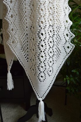 The name of the game is "Zero's created with the use of double and triple yarn overs in this wrap from start to finish. Begin with a taper at each end ( tassels are optional ). Widen out with the body pattern, 3 repeats of an eyelet circle, the center being a zero from 2 yo's. Bring on the pointed edge pattern, a slightly different eyelet pattern, the zero center created with the use of 3 yo's. This one will keep you busy, but oh.......what a wonderful and intricate design.