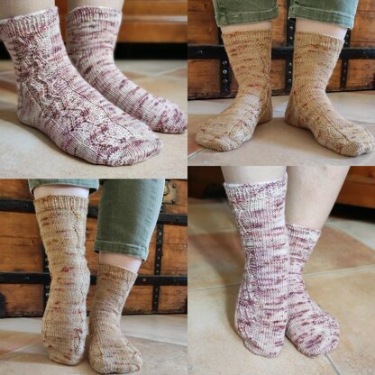 Zig et Zag are two patterns of socks. They are similar and different. Both are worked toes up, with a gusset and a heel flap. Both have faux cables on the top of the foot and on the ankle. Zig have a pair on faux cables on the external edge of each foot, while Zag have a faux cable on each side of the feet. Both are included in this pattern, so you can choose which one you prefer, or do both!