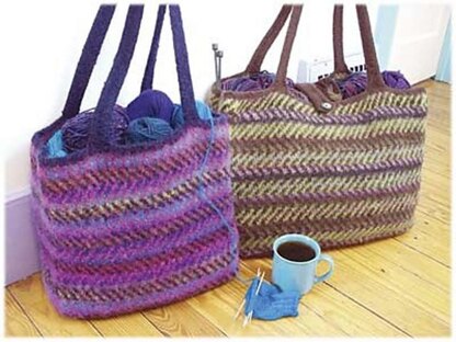 These larger bags offer significant visual depth by alternating two sets of solid/striping yarns, one set when the pattern “zigs" to the left, and the other set when it “zags" to the right. *Some knitters, however, have chosen just two yarns (which does save on yardage needed).*