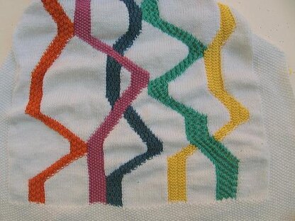 This was designed as a baby blanket / stitch sampler. With the suggested yarn and gauge it makes a square of about 61 centimeters. The design is worked in Intarsia, so there are up to 11 strands being worked in a single row. If worked as a stitch sampler in a single color, it would take 660-825 meters as you only need about a quarter of a ball for each of the colors (pink, blue, yellow, orange, turquoise).
