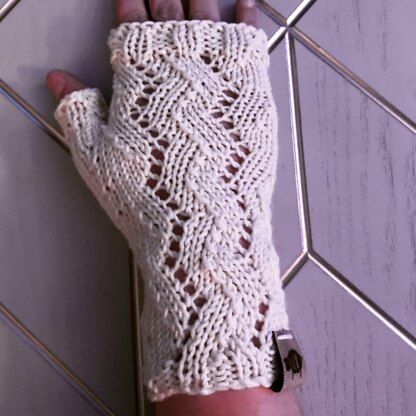 This pattern includes instructions to knit one pair of adult-sized fingerless mitts. The lace zigzag pattern is stylish, yet simple. The palm is worked in stockinette stitch for comfort. The thumb gusset is worked with the mitts and then moved to scrap yarn for finishing at the end. These mitts knit up quickly and make excellent gifts.
