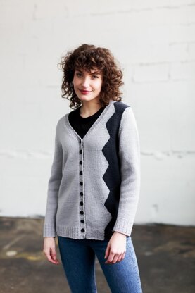 Colour wraps around the left front from the back in this two-tone cardigan, creating a dramatic effect without overstatement. The perfectly executed zigzag front—created through shaping, not charting—is an easy and satisfyingly neat introduction to intarsia colourwork.