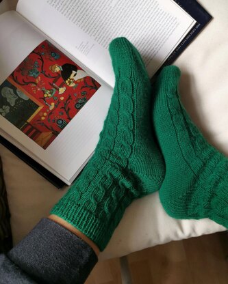 The ZOLA socks are cozy socks in a simple cable pattern. With classic 6-ply sock yarn and 3.0 mm (US