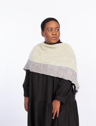 This shawl is mixture of stripes and cables making it a fun and easy to knit project. The shawl is crescent shaped and uses three colours.