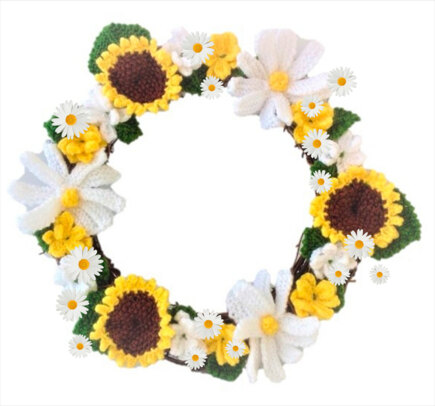 I love Sunflowers, but feel so sad that they do not last very long when picked, so I decided to knit this ring of everlasting summer flowers which incorporates Sunflowers and two sizes of daises. The flowers are easy to knit and do not take long at all. Just the perfect project whilst sitting in the garden watching the flowers grow!