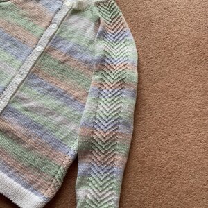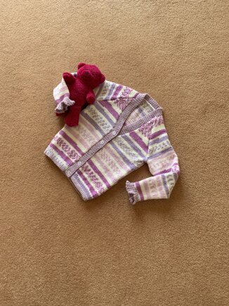 Notes: The size I knitted was 3-4 yrs, 20/22” chest, but actual measurement of 26”. Even though Martha’s now 4, she’s very slim so I’m hoping this size will fit her.