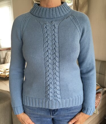 Notes: Knitted the neck 3 times! There is an omission on the pattern for when the stocking stitch should reverse so that the knit side of the collar is showing when turned over. I didn’t spot this until well into the collar so had to unpick back to where I thought it should be. Having finished and washed and blocked the jumper I decided that the neck was too wide and the collar flopped over and didn’t look like the pattern photos. So unpicked back to picking up the collar stitches and reduced the number of stitches around the raglans and on the cable, worked 10 rows stocking stitch then switched to 2 x 2 rib for the whole of the collar so matching the hem and cuffs. Pleased with the final result.