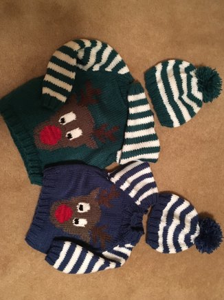 I made this for My 2 grandnephews age 2 and 6 months. I had to adjust the pattern for the little guy as the the pattern sizes started at 2-3 years - mapped it out on graph paper to accommodate the slightly smaller Rudi. Should make for cute Christmas card pictures!