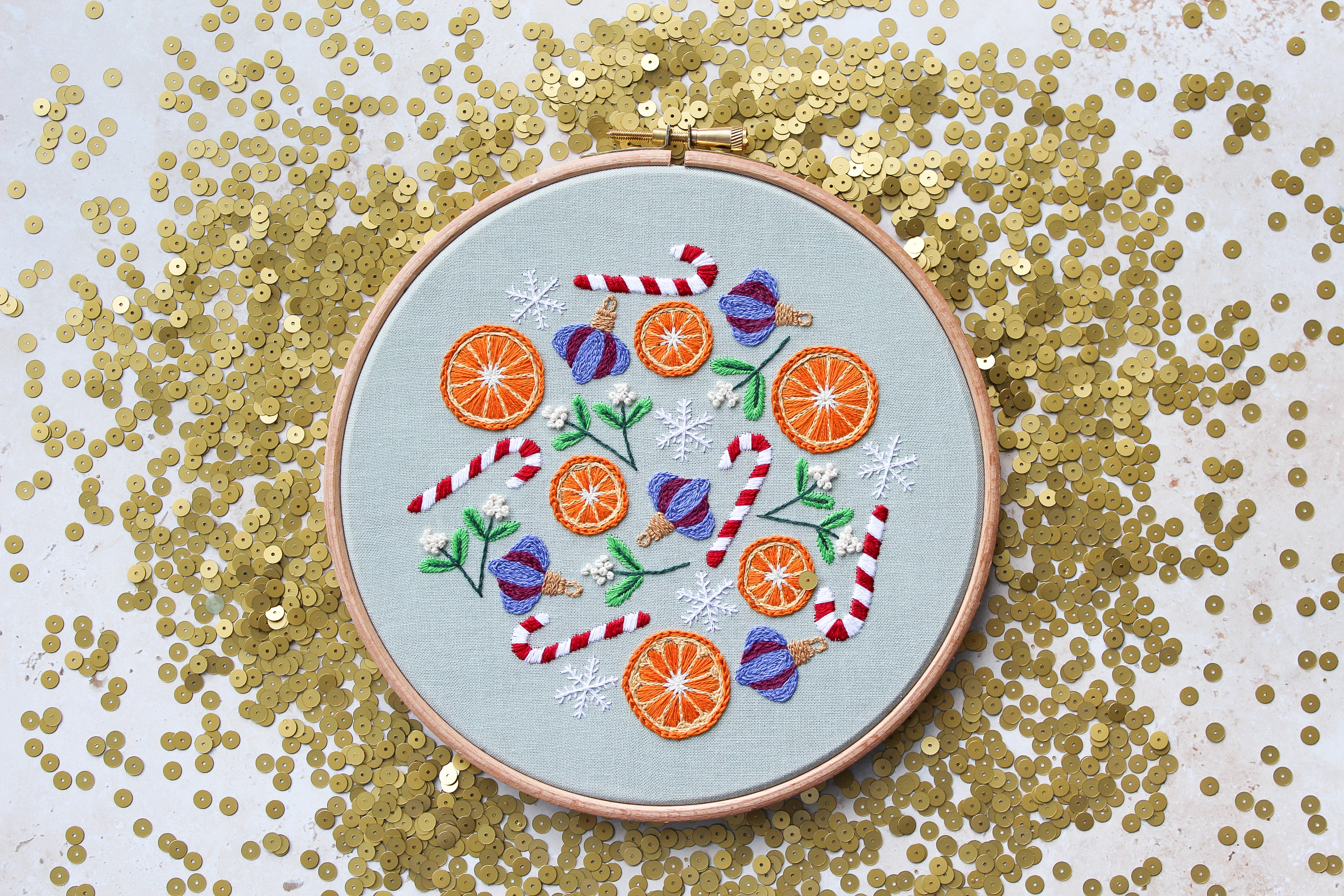 Published on November 25, 2022 1 min readIf you're searching for a fresh take on festive makes, this citrussy Christmas embroidery by Hope and Hart is the perfect project for you! Oranges, candy canes, mistletoe, baubles and snowflakes come together to create this eccentric embroidery, ideal for Christmas gifting or hanging up in the hoop in your own home!