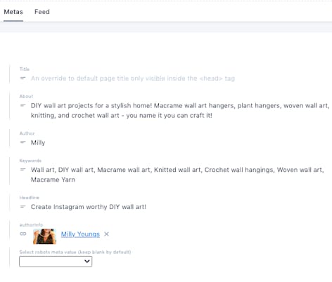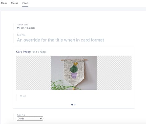 Before you finish your post you'll need to fill in the meta information (you can leave the 'Title' blank if you don't want to override your main title). Choose your author profile. Don't forget to select a date, and type tag to publish your post on our Inspiration feed.