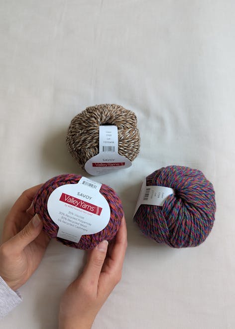 - Valley Yarns Savoy - an eco-conscious blend that includes recycled wool, recycled cashmere, recycled polyamide, and viscose, Savoy gives these luxurious fibres a second life.