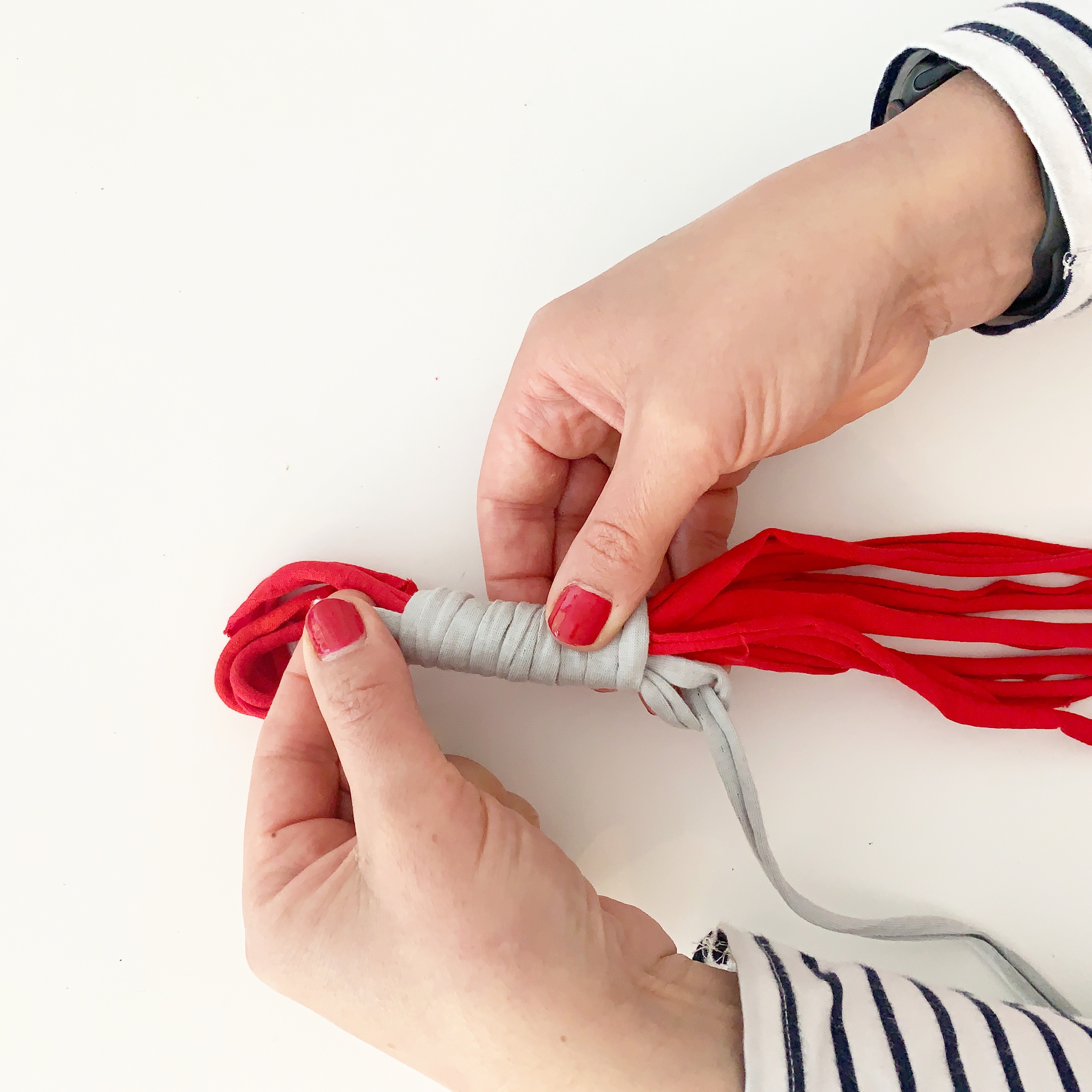 Fold the cord approximately four fingers in length back up to the starting point to create a loop and secure with your fingers where the two intersect. Now carefully wrap the cord (gray) around your group of cords (red).