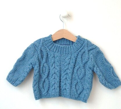 This cabled crew has a button-through opening across one shoulder for easy dressing.