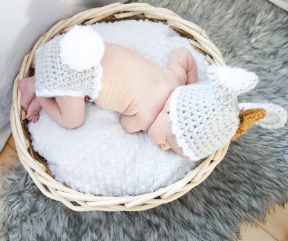SIZE 0-3 MONTHS (6 to 10 pounds) HAT : 15" circumference -- 6" length DIAPER COVER : 13-15" waist -- 7" thighs