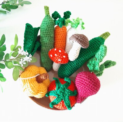Crochet amigurumi 10 vegetables set. You can make good toys for kids at all ages to play with. These crochet vegetables set are perfect toys for your kids to play and learn about vegetables. For babies you can simply use them to hang with baby mobile to stimulate eyes to colorful colors.