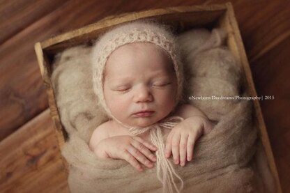Description: This is a PDF knitting PATTERN for a pretty angora bonnet for use as a newborn photography prop.