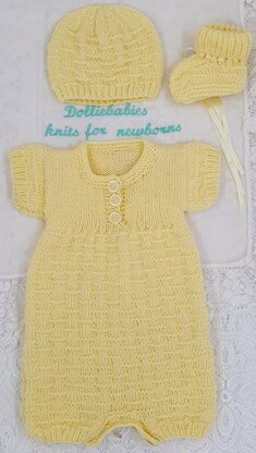 A simple baby or reborn doll romper with a matching beanie hat and bootees.