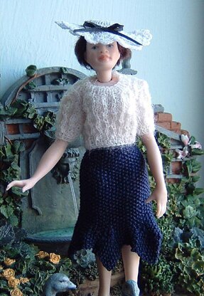 Knitting pattern to make a 1:12th scale ladies handkerchief edged skirt and wavy rib jumper c.1934 for the dolls house