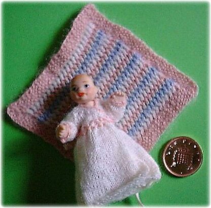 Materials Required: Shawl - 1 pair size 19 (1.00 mm/US size 5/0) knitting needles, 28 yards/25 metres 1-ply yarn in pink, 14 yards/12.5 metres in each of white and blue yarn or colours required. For a single colour shawl allow 42 yards/39 metres 1-ply yarn. Carrying coat - 1 pair size 19 (1.00 mm/US size 5/0) knitting needles, (Note for a Heidi Ott baby use size 21 (0.80 mm knitting needles), 28 yards/25 metres 1-ply yarn, small amount contrast wool or thread for smocking and crochet border; 12-inch (30 cm) length of 2 mm silk ribbon for ties, optional - 0.60 or 0.75 crochet hook.