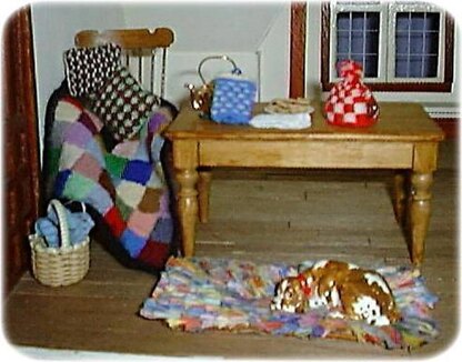 Comprising hot water bottle cover, tea cosy, lap rug, 2 cushions, knitting in basket and instructions for hooked rug.