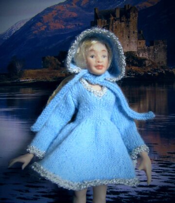 Pattern compises: 1:12th scale skating dress, panties, muff and hood. To fit a 14 cm tall dolls house doll