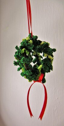 0.60 mm and 0.75 mm crochet hooks; 100 metres size 80 crochet cotton in dark or solid green; 50 metres size 80 crochet cotton in variegated or lighter green; 30 cm x 2mm wide red silk ribbon; 2 x metal plant rings about 3 cm/1¼-inches diameter; 30-60 cm/12 to 24-inch length of brown (or green) florist tape; sewing needle, optional – cocktail stick, miniature apples or red beads to represent berries. Note: Small paper leaves or red glass beads may be added to give texture to the kissing bough.