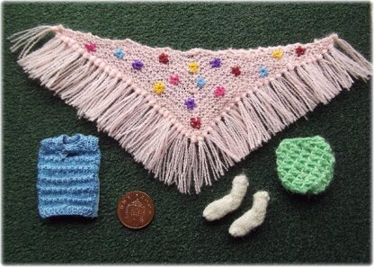 Approximate finished sizes: Blouse Front – 4.25 cm neck to waist, 3 cm across bust. Headscarf – 15 cm x 10 cm on other two sides (excludes fringe) Snood - 2.5 cm x 2 cm wide after elastic has been added. Ankle socks - 2 cm tall.