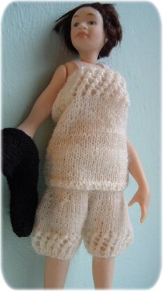 Materials required: Stockings - size 19 (1.00 mm/US size 5/0) knitting needles, 28 yards/25 metres 1-ply wool or cotton. Knickers - size 19 (1.00 mm/US size 5/0) knitting needles, 28 yards/25 metres 1-ply wool or cotton. Vest - size 19 (1.00 mm/US size 5/0) knitting needles, 28 yards/25 metres 1-ply wool or cotton, narrow ribbon for straps.