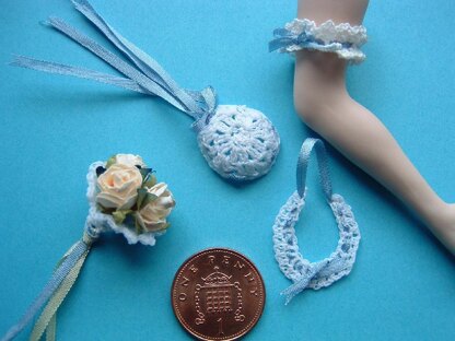 1:12th scale pattern for Wedding Favours-garter, plus stiffened posy holder, Juliet cap and horseshoe for the dolls house bride.