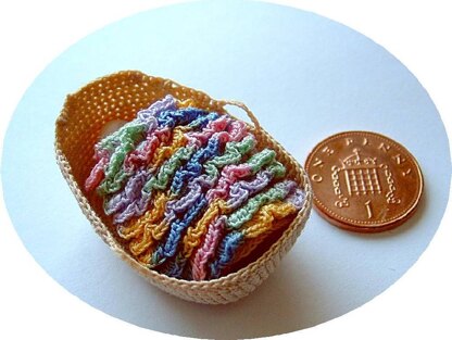 Materials required: Bassinet - 1 x 5g ball No. 80 crochet cotton or Tatting thread No 70, 0.50 mm crochet hook. Cover - size 0.60 mm crochet hook (US size 14 steel) for base, 0.40 mm hook (US size 16 steel) for ruffles, approx ½ a 5g ball of No.70 Tatting thread or No. 80 crochet cotton.