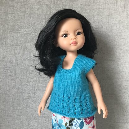 This is a relaxed-fit lacey top for Paola Reina or other 13" dolls. The square neck is finished with garter stitch edging and the sleeveless armholes give a nice off-shoulder short sleeve look. It’s knitted up in two pieces and joined at the sides and shoulder seams. A lacey eyelet pattern, on a stocking stitch background, has been used to achieve this look.