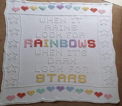 Blanket reads: WHEN IT RAINS LOOK FOR RAINBOWS WHEN ITS DARK LOOK FOR STARS