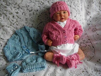 Instructions for a reborn doll or baby lacy cardigan, beanie hat and bootees set in either 4ply or DK yarn depending on size. This little cardigan set is suitable for either a boy or a girl. When knitted it will fit either a 12-13" 13-14", 15-16" or 16-17" height baby (approx 1.5lb - 4.5lb) or reborn doll. You will need 100g 4ply or double knitting yarn, 3.25mm needles, 3.25mm-4mm needles, 3 buttons and 1 metre of narrow ribbon to complete.