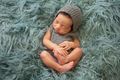 This is a PDF knitting PATTERN for a super cute newborn hooded romper/onesie. There are buttons at the gusset to allow you to slip this over a baby's head. The v opening at the front is also wide and is designed to have yarn ties to hold it together.
