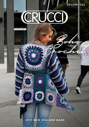 Women's boho crochet jacket. Uses 8ply wool - suggested yarns are Crucci Angelina and 8ply Machine Wash. Requires 21 balls of wool in total.