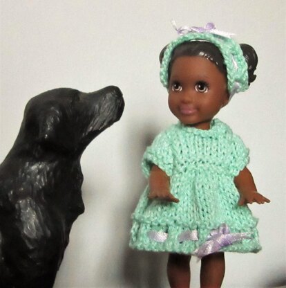 Pattern includes dress with sleeves, sleeveless dress, panties, headscarf and headband.