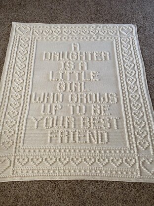 I'm excited to add my newest design to my store. The blanket reads A DAUGHTER IS A LITTLE GIRL WHO GROWS UP TO BE YOUR BEST FRIEND Any daughter would love to have this blanket, knowing all the love put into making it.
