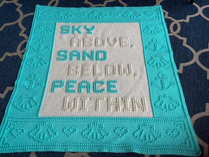 Blanket reads: SKY ABOVE SAND BELOW PEACE WITHIN