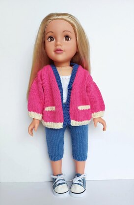 I published a pattern for chunky cardigans for Barbie last year so decided to amend the pattern to fit my new doll, an 18" Designafriend doll. The set includes a cardigan, leggings and a vest top and should fit most dolls of this type. However, as all dolls are different its best to check for fit as you go. Note that the cardigan is a roomy fit. All pieces are made using straight needles.