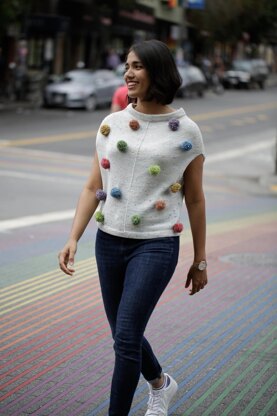 With Garter stitch edges and a Stockinette body, this slouchy top with lowered armholes knits up in no time with simple construction that is perfect for layering. The party gets going with an exuberance* of pom poms placed as you wish: along the neckline, scattered all over as shown, spelling out LOVE—the possibilities are endless! For the pom poms I turned to the expert, Loome founder Vilasinee Bunnag, who showed me some of the many pom pom options you can create with a Loome tool (plus tassels, braids, and more), and we created a rainbow of pom poms to adorn this top.