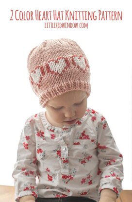 The Two Color Heart Hat Knitting Pattern is brand new and a really fun knit for someone's first Valentines! This Baby Heart Hat requires basic knowledge of stranded or fair isle knitting techniques and does require you to knit with three colors of yarn at once for a few rounds (it's not as difficult as it sounds!). I just love the way these two color hearts turned out with the white inside and red border. This is such a cute Heart Hat Pattern!
