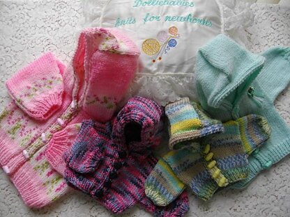 Instructions for a reborn or baby Classic Hoodie in either 4ply or DK yarn. Different looks can be achieved by using any of the self patterning yarns that are available on the market today. Instructions are in nine sizes, premature 1lb through to 0-3 months or 10-22 inch reborn.This pattern is suitable for a beginner with some experience of picking up stitches. You will need between 50g-150g of either 4ply or dk yarn depending on what size you wish to knit, 2.75 - 4.5mm needles, 1 stitch holder and 5 buttons to complete it.